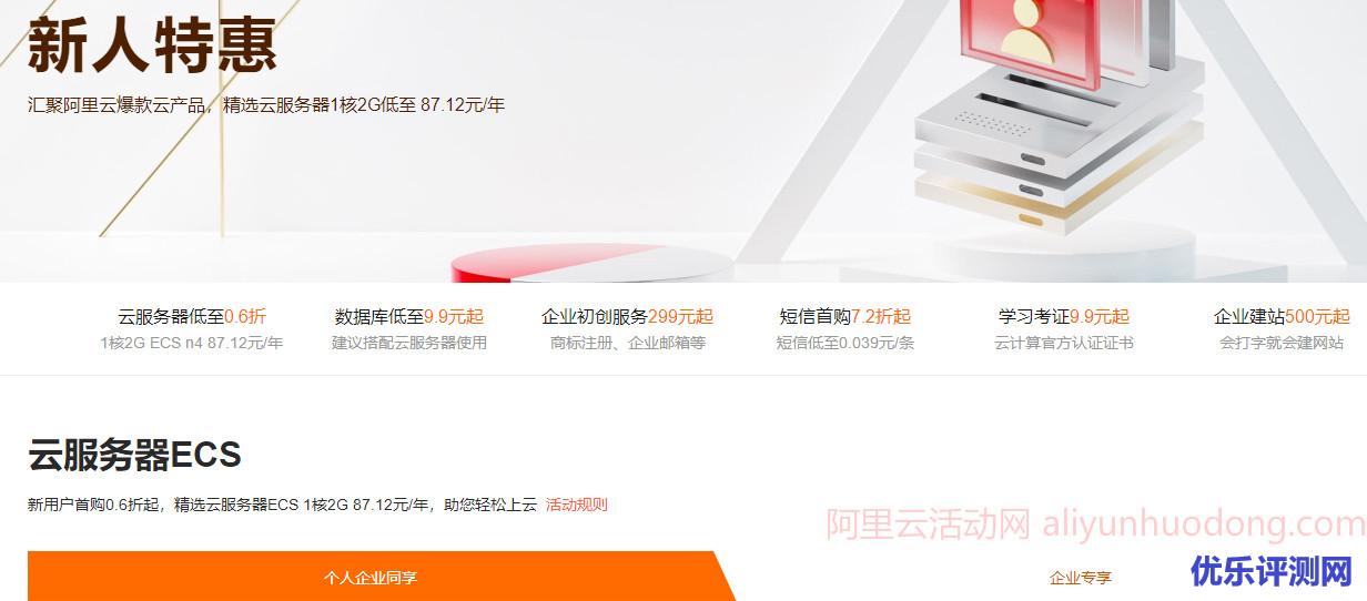 个人用户推荐参加新版新人特惠活动,云服务器0.6折起出售,最低仅需9元即可拥有自己的云服务器。活动地址:点击进入新人特惠活动
