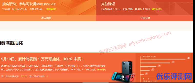 登录用户每日自动领取一次抽奖机会,参与可获得MacBook Air。活动期间9.1-9.10,充值送券,最高返¥1800。9月10日,累计消费满 1 万元可抽奖,100% 中奖!