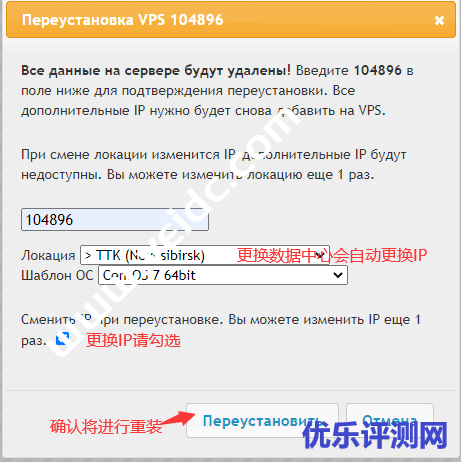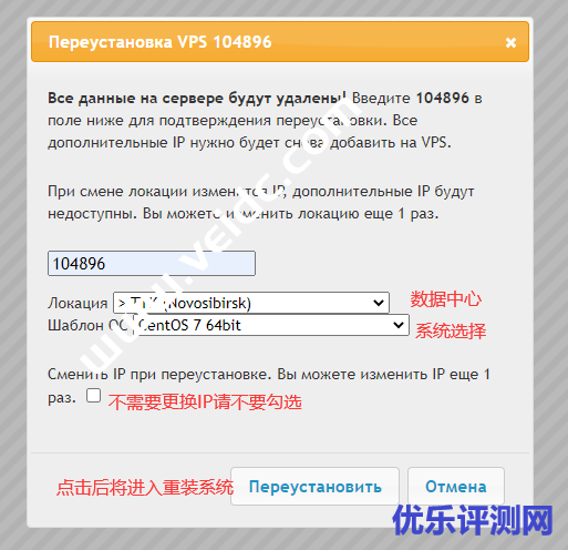 如果只是重装系统,无需更换数据中心和IP,请保持下图选项即可: