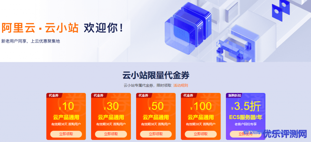 进入云小站之后,上面还有阿里云产品通用代金券,在支付订单的时候可以当做现金使用(适合自定义购买包年包月使用),需要的用户可自行免费领取。