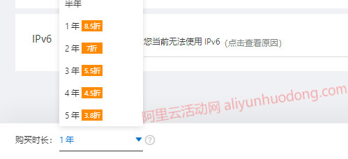 购买时长可以按月、包年购买,按月购买虽然看起来费用低一些,但是没有优惠,包年购买都是有优惠的,目前阿里云提供的包年优惠是1年8.5折、2年7折、3年5.5折、4年4.5折、5年3.8折,如果你项目需要长期运行,还是选择包年比较好。另外需要注意的就是如果要备案就至少买3个月,购买时长低于3个月的阿里云服务器是无法备案的。