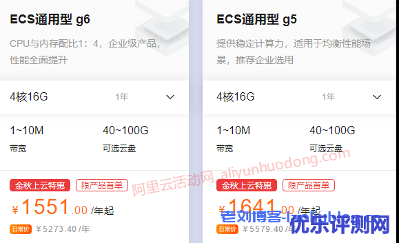 - ECS通用型g6:4核16g,1-10M带宽可选,40-100G可选云盘,优惠价格为1551.00元/年起、4466.88元/3年起;
