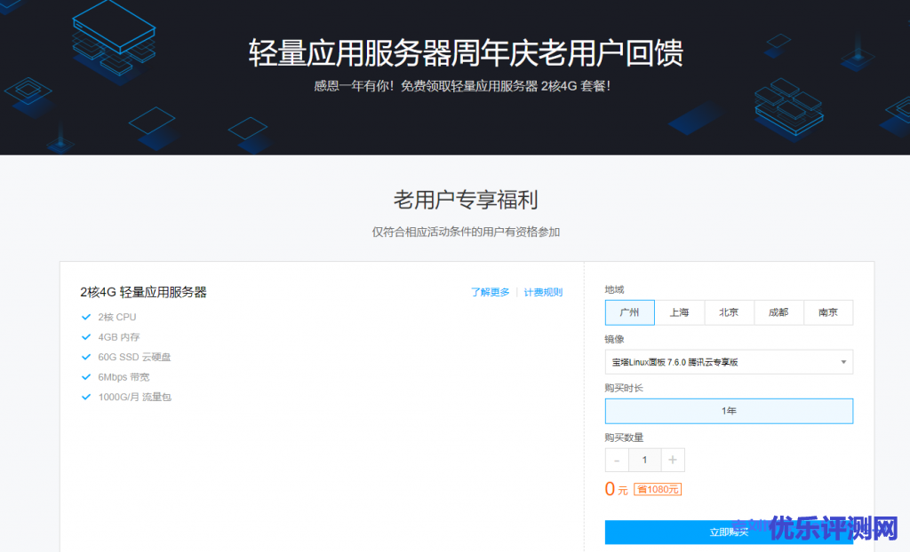 如果阅读过老刘博客前文《腾讯云轻量应用服务器怎么样?来听听Lighthouse产品经理钟宇澄Pablo自述》,应该有了解到腾讯云轻量应用服务器Lighthouse已经发布一周年了,腾讯云为了回馈老用户特地搞了个免费送机器的活动,良心云果然良心!免费领1台1年的Lighthouse机器配置是2核4G内存60G SSD云硬盘6M带宽1000G月流量,这款原价是1080元,机房可选广州、上海、北京、成都和南京。