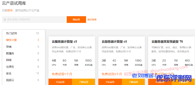 然后网页就跳转到免费领取云服务器界面,我们点击“云产品试用库”中的弹性计算可以看到自己可以免费领取的阿里云服务器配置及免费时长了 。