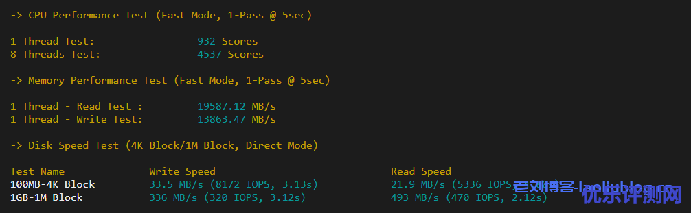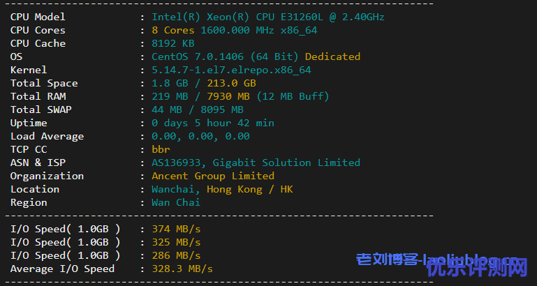 配置信息:CPU为e3-1260L,4核心,8线程,主频为2.4G,内存8G,硬盘问240G SSD,开启bbr测试,I/O测试平均为328MB/s