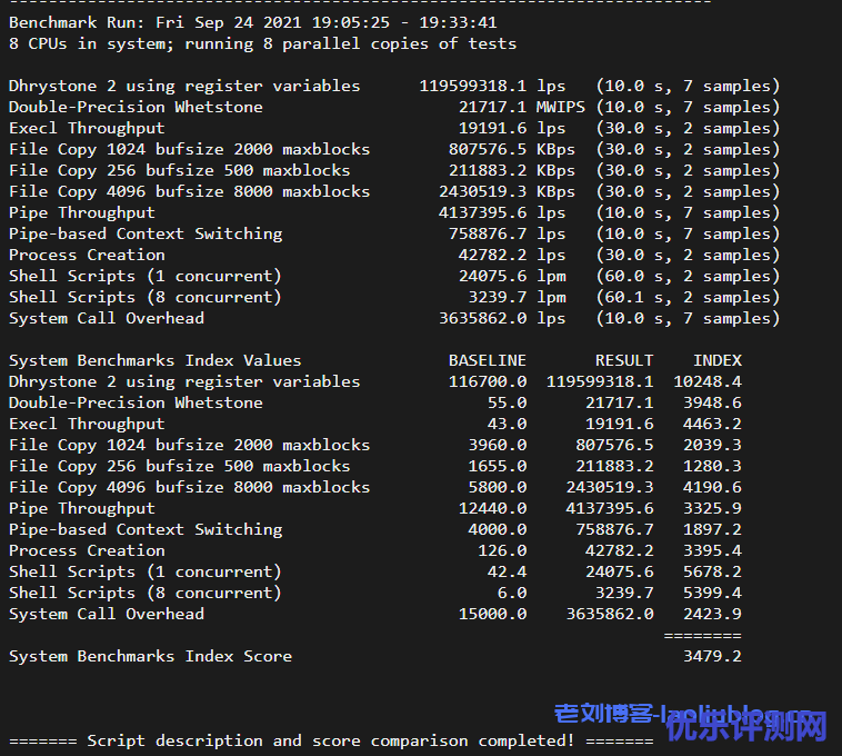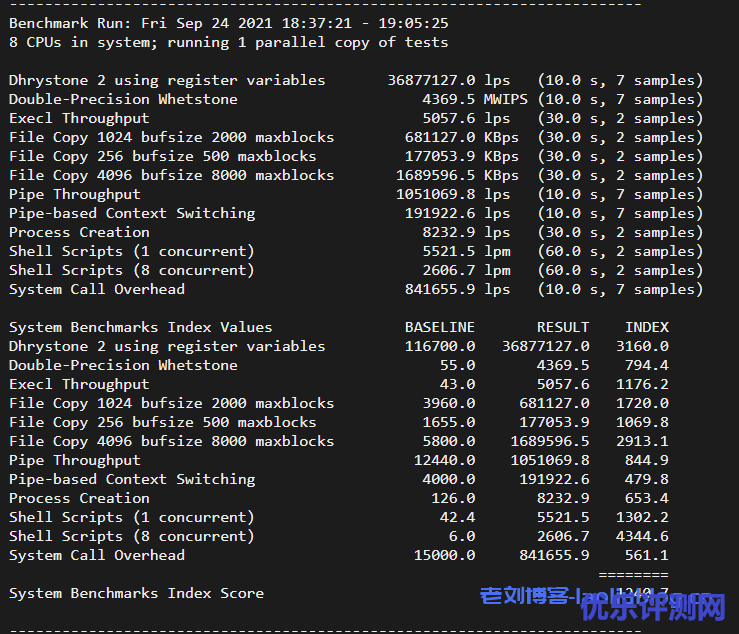 Unix bench跑分测试,单核1240分,多核3479分,性能不错