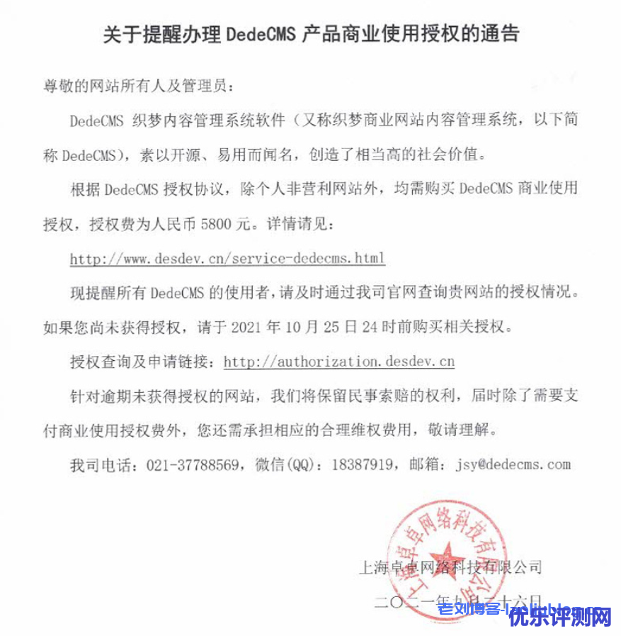 织梦DedeCMS通告入口:关于提醒办理DedeCMS产品商业使用授权的通告