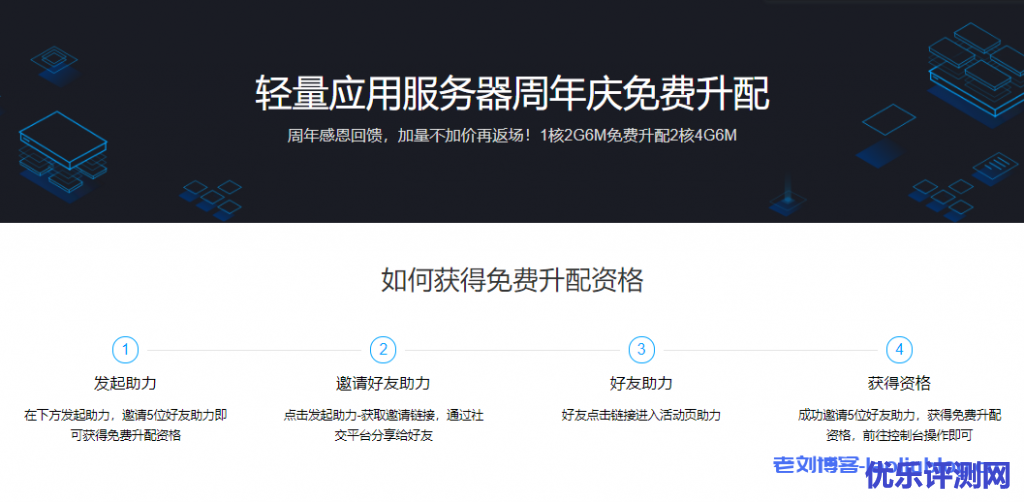 完成分享助力,即可获得轻量应用服务器 1核2G6M 套餐免费升配至 2核4G6M 套餐资格
