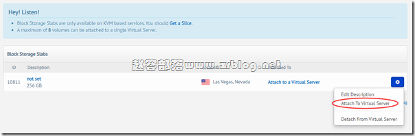 然后我们将存储块分配给VPS主机(如下图,点击右侧Attach To Virtual Server)