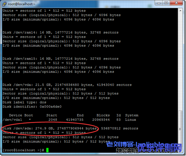 登录VPS主机,使用命令fdisk -l可以看到我们分配上来的磁盘空间,如下图红色框中所示,我这里买的是一个256GB的存储。