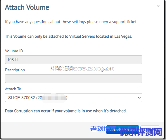 下面弹出的页面我们要在Attach To框中选择自己的VPS主机,选择后点击Attach Volume即可。