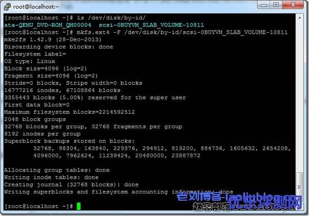 [root@zrblog ~]# mkfs.ext4 -F /dev/disk/by-id/scsi-0BUYVM_SLAB_VOLUME-10811