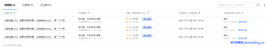 老刘博客尝试登录了自己的腾讯云企业账号,官方分配了3张代金券:88元券(满99元可用)、75元券(满84元可用)和25元券(满28元可用)共计188元券。代金券适用于部分腾讯云预付费产品新购、升级和续费,有效期60天。具体适用产品是:云服务器CVM、轻量应用服务器、云数据库MySQL、云数据库Redis、小程序云开发TCB_mp、Elasticsearch Service、云硬盘CBS。