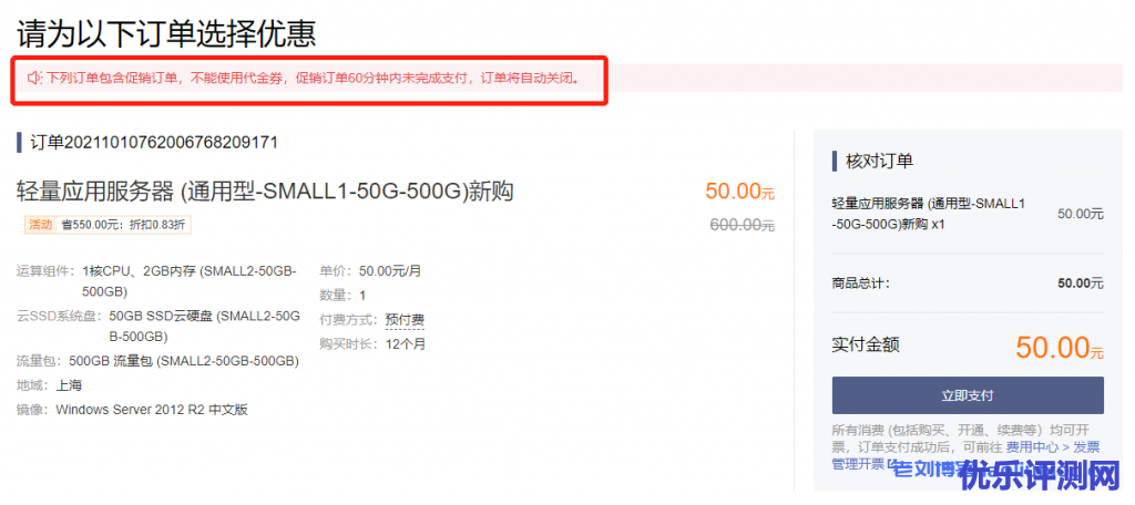 最后需要提醒大家的是,腾讯云现在的促销活动订单不能使用上面领取的代金券,比如现在年付50元的腾讯云轻量应用服务器你想使用25元券,25元拿下,对不起!它做不到!不过能领则领,领了备着,等双11时候看看能买些啥吧。