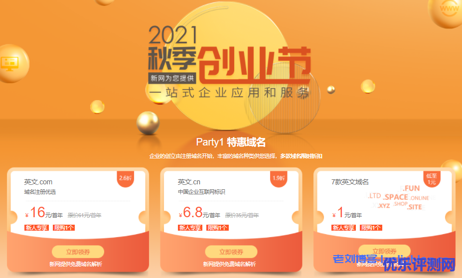 新网2021秋季创业节活动入口:新网金秋特惠_域名价格仅1元_免费建站_免费企业邮箱_新网-新网 (xinnet.com)
