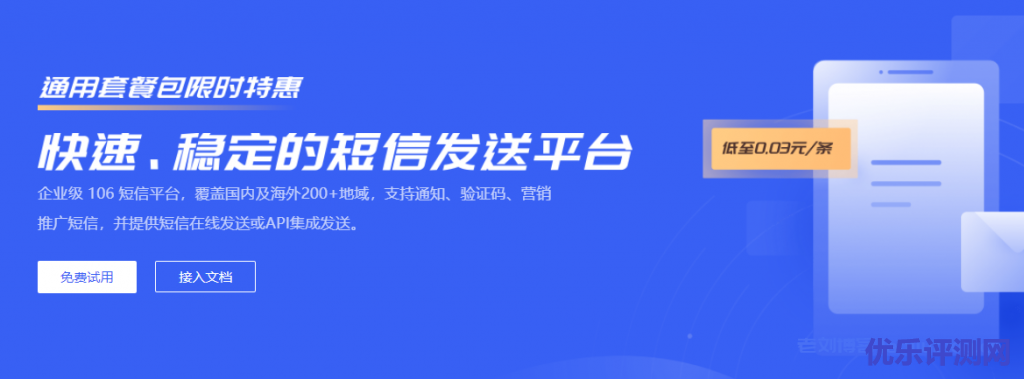 UCloud短信发送平台快速、稳定,企业级 106 短信平台,覆盖国内及海外200+地域,支持通知、验证码、营销推广短信,并提供短信在线发送或API集成发送,支持免费试用(联系在线客服),现在UCloud最新上线短信通用套餐包限时特惠活动,一条短信仅需3分钱!免费试用接入文档
