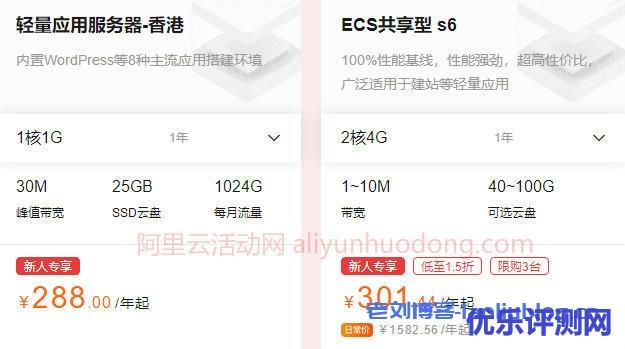 另一个入口是直接在活动上下单购买活动机型,比如这个:阿里云·云小站服务器特惠活动,阿里云2核4G服务1M带宽,同样是ECS共享型s6实例,一年价格301.44元,如下图: