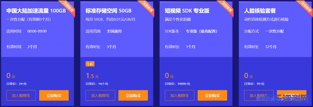 新客注册 0 元起,标准存储 0.01元/GB/月,包括中国大陆加速流量100GB免费试用3个月,标准存储空间 50GB,短视频SDK专业版,人脸核验套餐。立即前往>>