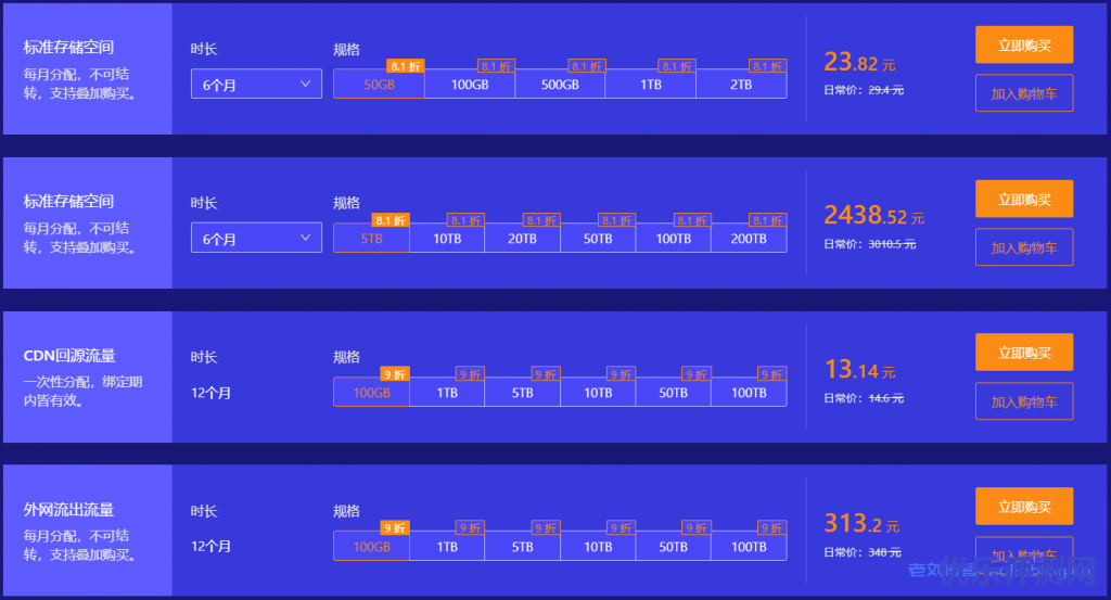 国内区域标准存储空间,适合社交应用、内容分享、热点对象存储等场景。标准存储空间每月分配,不可结转,支持叠加购买。规格有50GB,100GB,500GB,1TB,2TB,5TB,10TB,20TB,50TB,200TB,时长6个月,均8.1折;时长12个月,均6.6折。CDN回源流量,一次性分配,绑定期内皆有效。规格有100GB,1TB,5TB,10TB,50TB,100TB,有效期12个月,折扣均为9折。外网流出流量,每月分配,不可结转,支持叠加购买。规格有100GB,1TB,5TB,10TB,50TB,100TB,有效期12个月,折扣均为9折。立即前往>>
