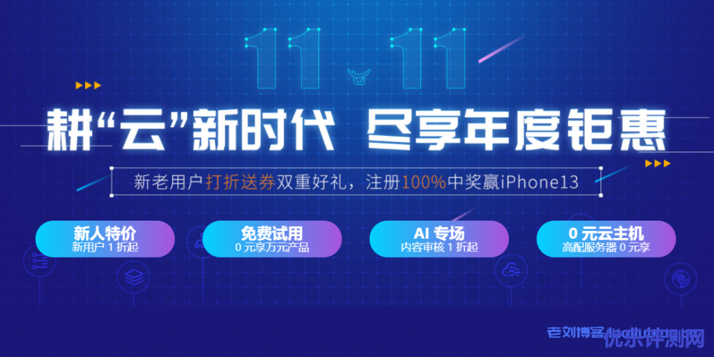 从2021年10月18日到2021年11月30日,七牛云开启双11年度钜惠活动,主题为耕”云“新时代 尽享年度钜惠,新老用户打折送券双重好礼,注册100%中奖嬴iPhone13!七牛云双11年度钜惠内容有新人特惠-新用户1折起,免费试用-0元享万元产品,AI专场-内容审核1折起,0元云主机-高配服务器0元享。