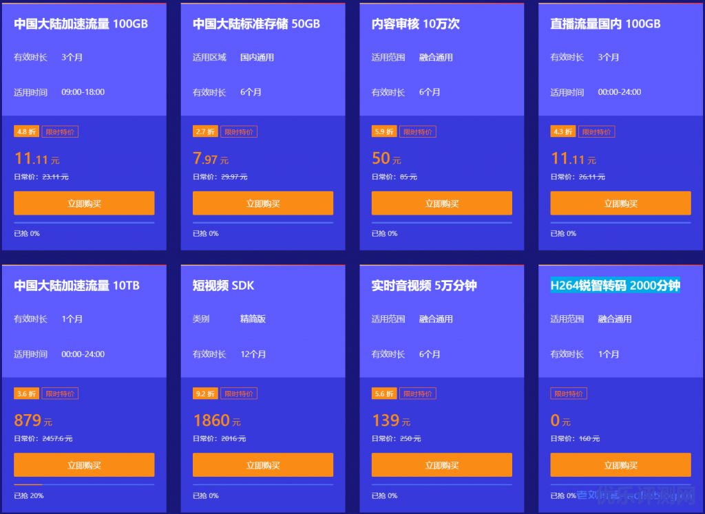 另外七牛云双11年度钜惠还有CDN流量,云主机QVM,短视频SDK,直播流量Pili,实时音视频RTC,视频监控QVS等产品活动策略,具体可以前往七牛云官网查看>>