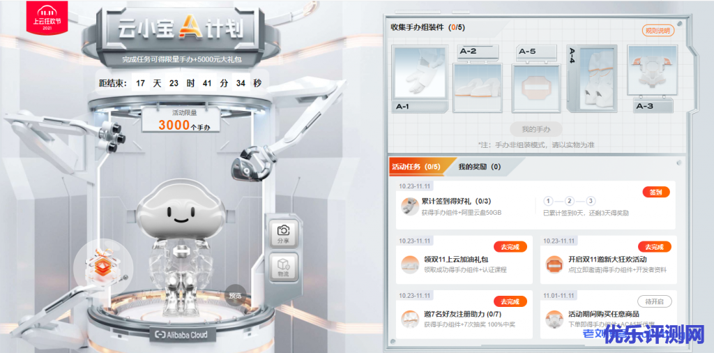 阿里云云小宝A计划要完成5项任务,赢取5个手办组件即可得云小宝手办(*注:手办非组装模式,请以实物为准):