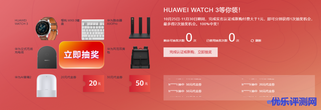 HUAWEI WATCH 3等你领!10月25日-11月30日期间,完成实名认证或新购付费大于1元,即可分别获得1次抽奖机会,最多得2次抽奖机会。100%中奖!