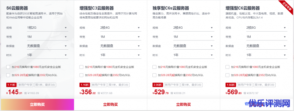 1核2G1M S6云服务器首年145.31元,2核4G1M增强型C3云服务器首年356.32元。
