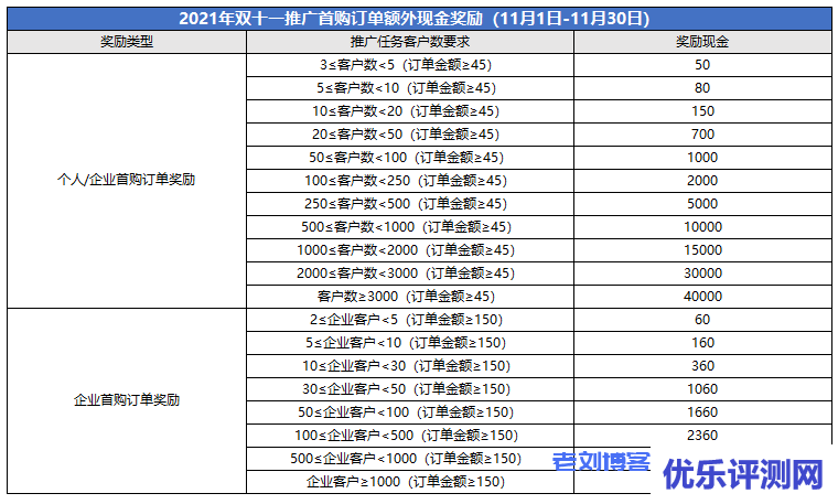 (1)同时满足以下条件订单可参与本次【双十一首购订单额外现金奖励】:①为客户首购订单;②【个人/企业首购订单奖励】实付订单金额≥45,【企业首购订单奖励】实付订单金额≥150;③满足CPS返佣条件订单(详见CPS推广奖励规则)