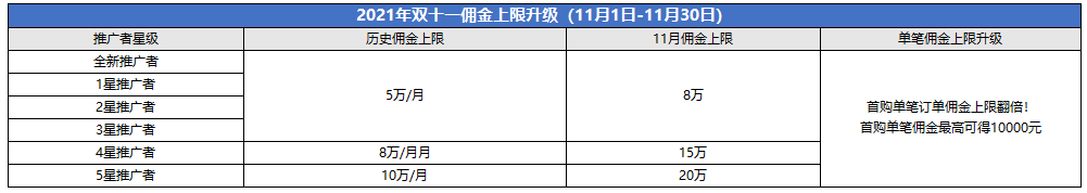 举例:某推广者为5星级会员,11月推广佣金21万元,额外现金奖励6万元,并在双十一主会场获得iPad Pro一部。由于佣金封顶,该推广者11月最终可得到账金额为佣金20万元+额外现金奖励6万元+iPad Pro。
