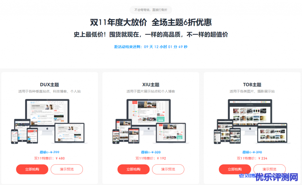 专业WordPress主题服务商themebetter(theme 意思为“主题”,better 意思为“更好的”,这两个简单的单词合在一起就是“更好的主题”。)的双11活动专场开启了,双11年度大放价,全场主题6折优惠,史上最低价!囤货就现在,一样的高品质,不一样的超值价:DUX主题480元,XIU主题192元,TOB主题234元,ENT主题480元,D8主题138元。