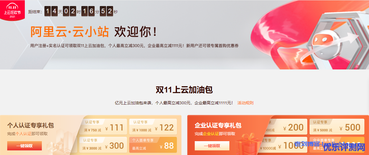 阿里云官网已实名认证的注册会员用户皆可领取双11加油包,该加油包分为个人用户和企业用户,可根据您的账户类型选择领取,同一用户活动期间只可领取1次,不可重复参与。