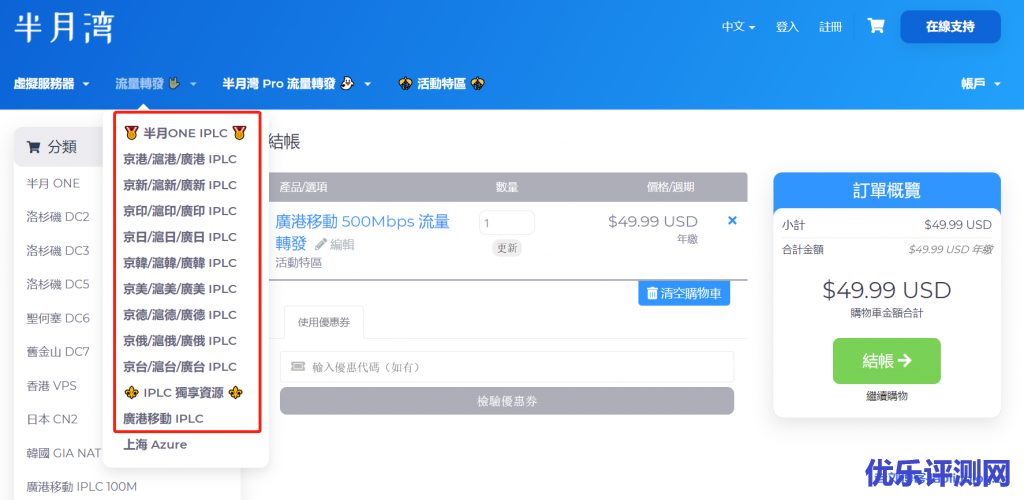 广港移动IPLC限量50个,半月ONE(IPLC多线)包括广港、广新、广印、沪日、沪美、沪俄、沪德、沪新、沪港、广港移动IPLC(购买时使用优惠码:HMBONE),洛杉矶AS9929线路VPS为预售限量100台