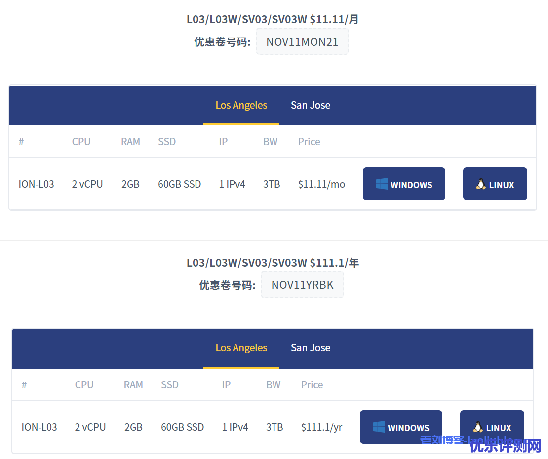 krypt旗下云服务器品牌iON Cloud云平台,当前发布了2021年双11促销活动,拿出了两款美国VPS套餐参加11.11大促,可选洛杉矶或圣何塞机房。促销1:套餐L02/SV02 (Linux only) $11.11/季;促销2:L03/L03W/SV03/SV03W $11.11/月; L03/L03W/SV03/SV03W $111.1/年。注释:L是洛杉矶,SV是圣何塞。活动时间从11月10日开始到11月30日,套餐售完即止。