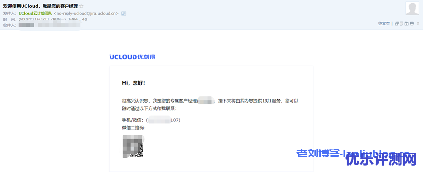 买云服务器,我们也同样重视“云服务”体验。相比一些云厂商,注册登录账号后不断地被系统询问是否要关联旗下代理商,以及被各家代理商电话骚扰,智能客服来回让我们选择入口,UCloud主要是直销模式,能提供1对1客户服务:注册账号后会收到UCloud推送的系统给用户自动分配的客户经理联系方式的邮件,同时也能在官网右下角人工客服咨询入口随时处理售后问题。咨询客服>>