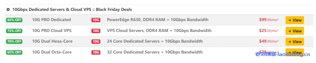 国内折扣促销年度大戏双11活动已经落下帷幕了,不过服务器采购最佳时机并未结束!当下国外IDC主机商家已陆续开启了自家的黑色星期五Black Friday Sale促销模式,老刘博客也从不同渠道获悉了一些商家的促销内容,并汇总供大家参考,分别是Contabo、PacificRack、ProfitServer、Psychz、signaltransmitter、SpeedyPage、Turnkeyinternet、FDCServers、Quantum Core、IDCLAYER(排名不分先后)。
