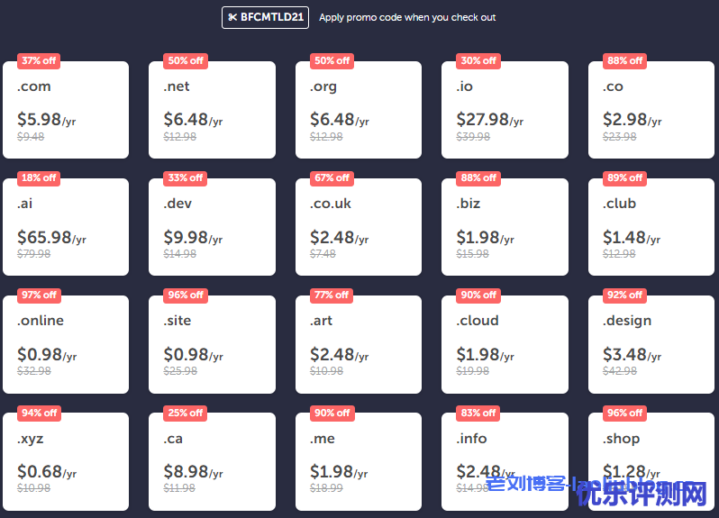 本次黑五优惠,需要使用到注册优惠码:BFCMTLD21,由于域名比较多,这里就不一一列出了,截图给大家看下。一般推荐选择.com,.net,.org这些后缀域名。
