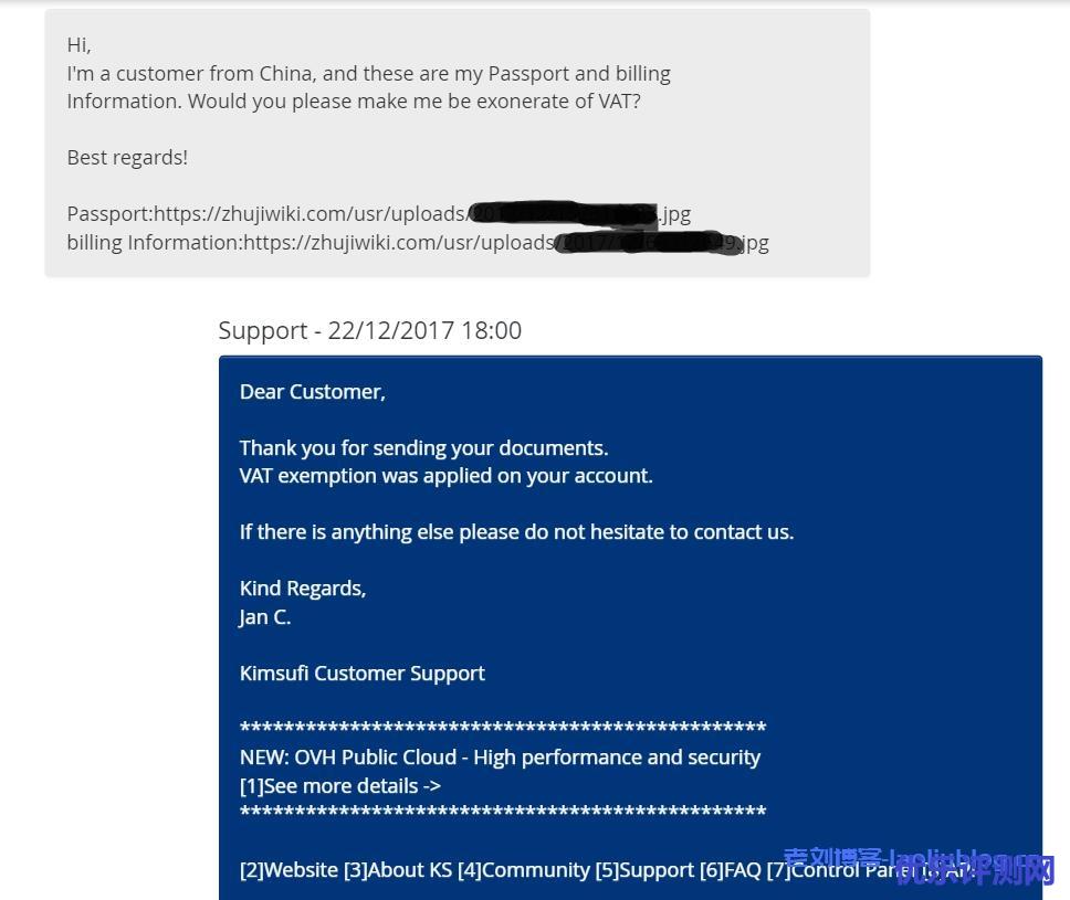 kimsufi免税的实质是确认你非欧洲人,主要依靠英文地址确认。我是用的是国内护照和Paypal英文账单(含地址的),英文地址要和注册kimsufi地址一样,一天内申请通过。Paypal英文账单可以在Paypal上获取(建议更改语言为英文)