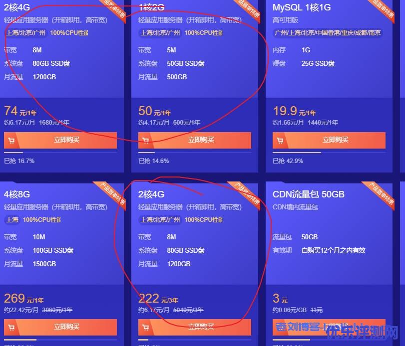 - 云服务器 2核 4G内存 80GB SSD空间 8M带宽 1.2TB月流量,年付74元,3年付222元;