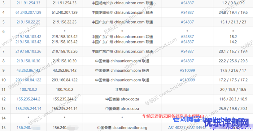 华纳云香港云服务器电信去程在省内就开始走59.43的路由,回程也走59.43开头的路由,标准的电信CN2 GIA线路,电信延迟才33ms。联通往返也是直连,去程延迟甚至才25ms。移动去程回程也都是直连,延迟稍高,也只是刚过40ms。华纳云香港云服务器三网路由都非常好。