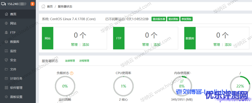 华纳云香港云服务器在安装宝塔面板并配置默认的LNMP环境之后,内存还有3.6G的剩余,硬盘只用了4.4GB,双核CPU再配上这么大的剩余内存,搭建网站的话硬件资源是非常富裕的。