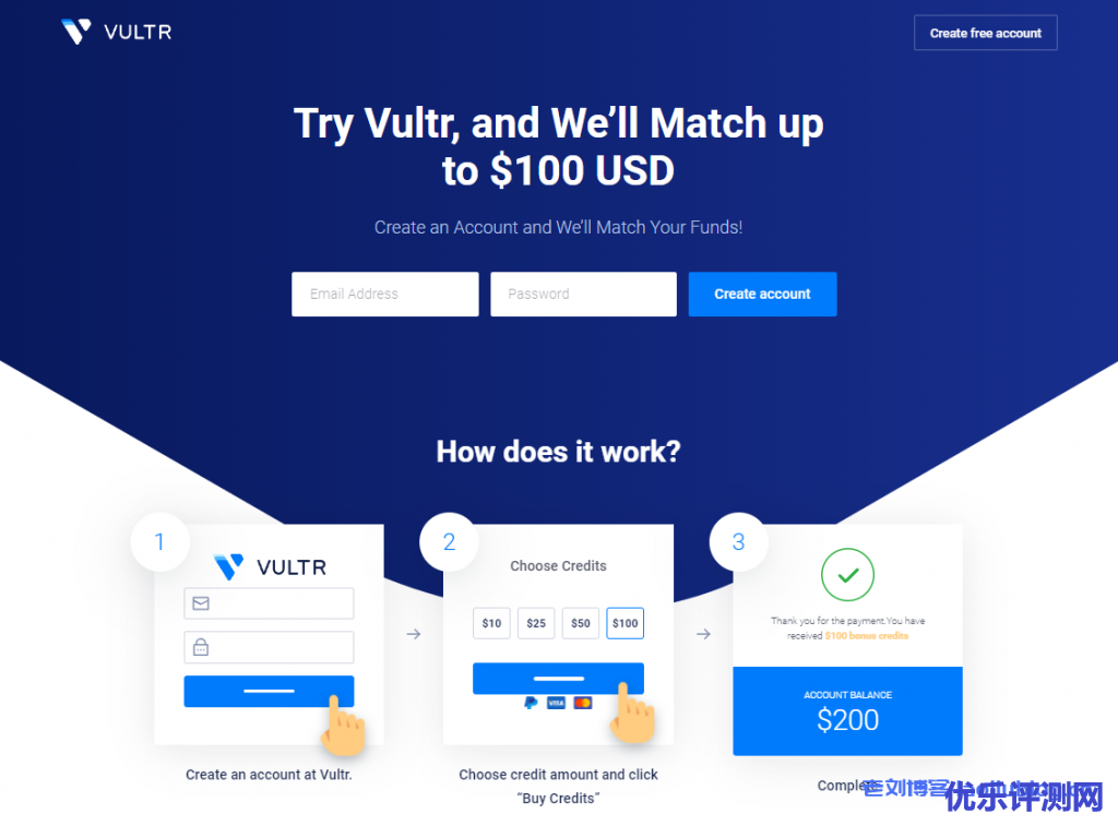 活动地址:https://www.vultr.com/match,如上图,首先创建账户,然后选择充值,完成后获得赠送。
