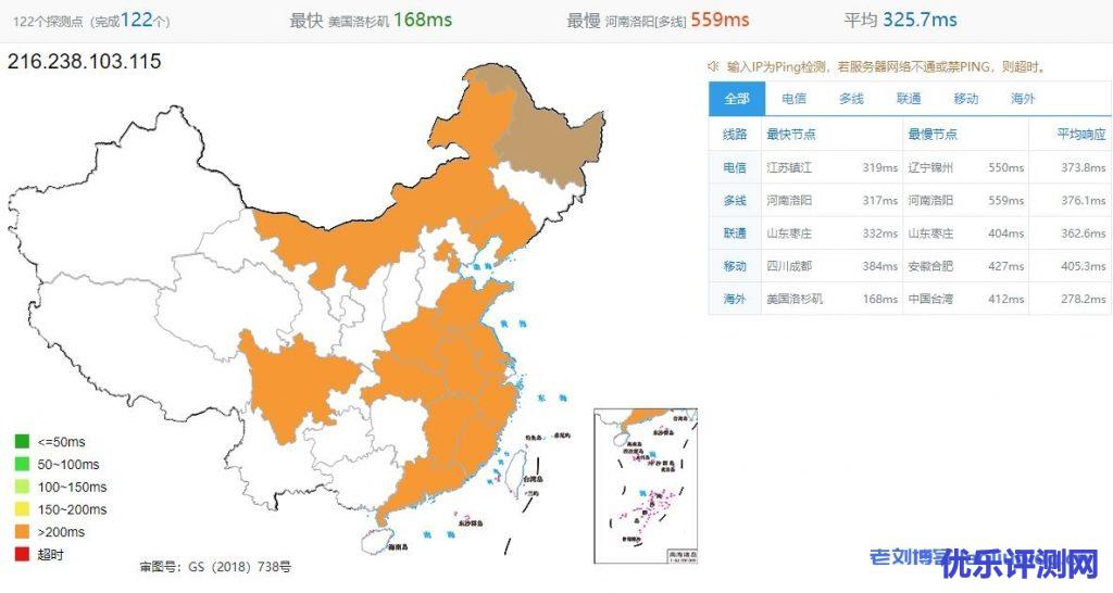 可以看到全国平均延迟就是在370ms左右,电信和联通差不多,一定要稍微高点。另外海外地区访问最快的是美国洛杉矶。