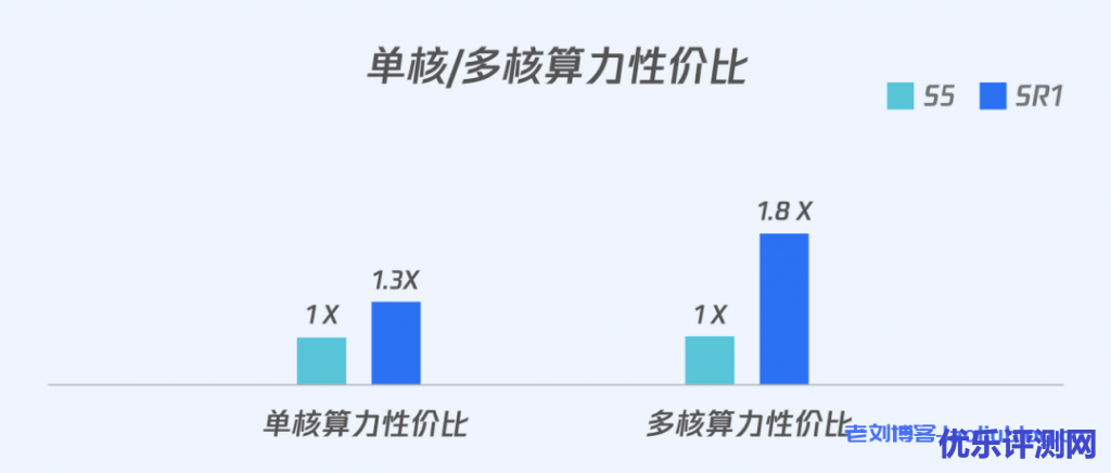 我们对比同规格配置下 SR1(Ampere Altra Q80-30)和 S5(Intel(R) Xeon(R) Platinum 8255C CPU)的计算性价比,从测试结果来看,SR1 算力性价比整体比 S5 更优,最高有 83% 的性能提升。值得注意的是,对于 SR1 来说,得益于 ARM 处理器单核单线程的设计,其多核并发性能优于 X86 服务器,因此多核算力性价比较单核算力有更明显优势。