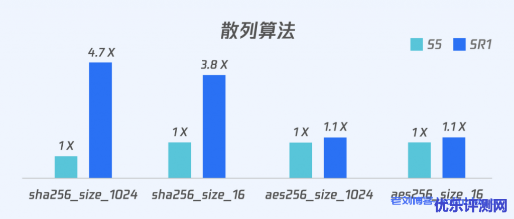 加解密运算能力也是处理器性能的衡量标准之一,加解密类型的计算任务不仅反应处理器的计算访存能力,更直接体现其扩展指令集的性能。AES 和 SHA256 算法都是目前较主流的加密算法,下面的测试结果展示的是在这两个算法上 SR1 对比相同规格的 S5 性能表现。