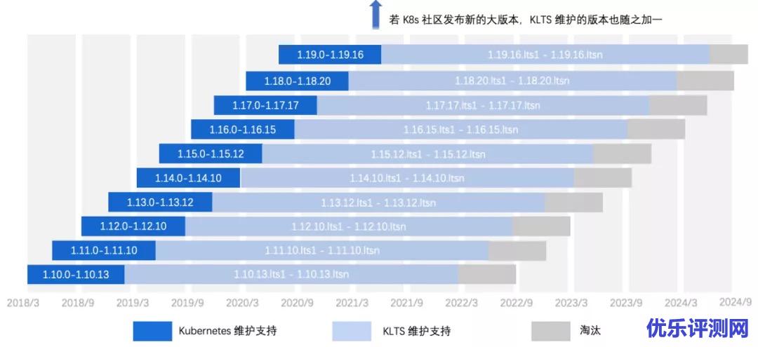 因此,根据社区版本维护声明,如果社区仅维护最近的三个版本,版本号即为 x.y、x.(y-1)、x.(y-2),而 KLTS 维护的则是从 1.10 起,到 x.(y-3)的近十个早期版本,如下图所示。
