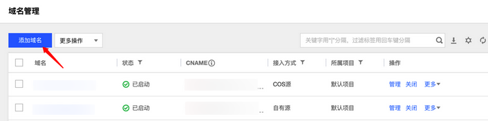 登录 CDN 控制台,在左侧导航栏中,单击域名管理进入域名管理页面,单击添加域名。
