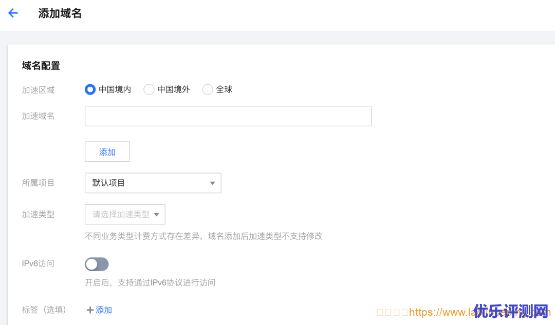 在域名处填充您需要加速的自身的服务域名,为其选择项目、加速区域及业务类型: