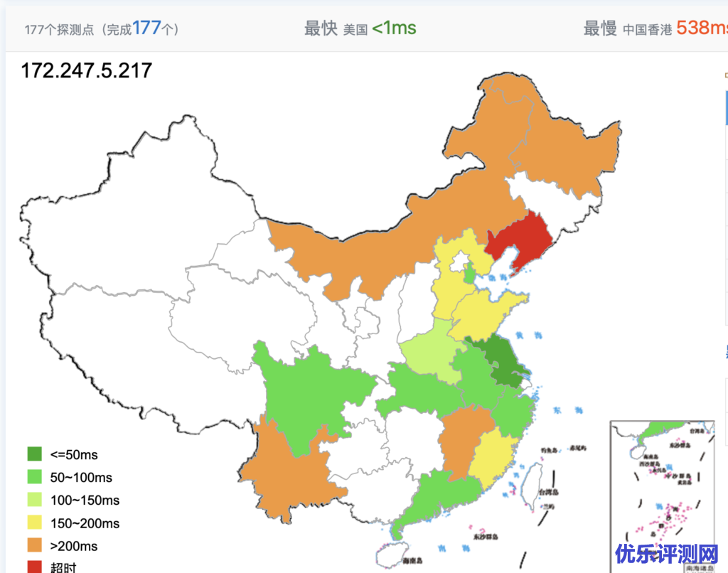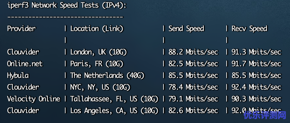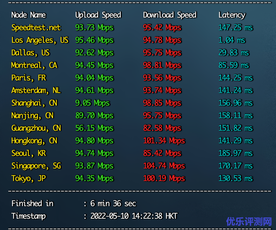 官方网站上面写的是默认是100Mbps带宽,我们直接用在中国大陆的三网的节点来做个带宽的上下行测试,看看可以跑到多少。数据如下,上行是100Mbps,下行是100Mbps: