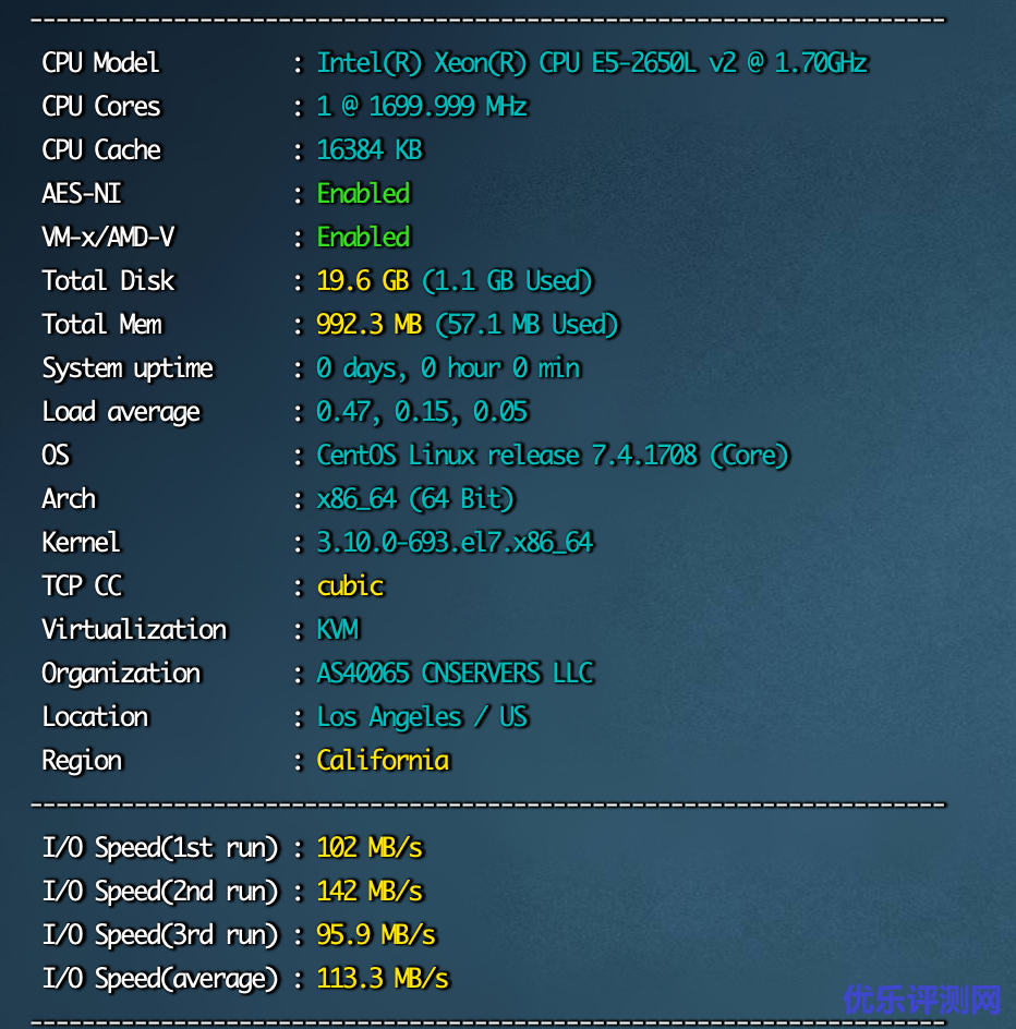 从拿到的VPS来看,CPU是e5-2650Lv2 @1.70GHz 硬盘I/O大致在/S的样子: